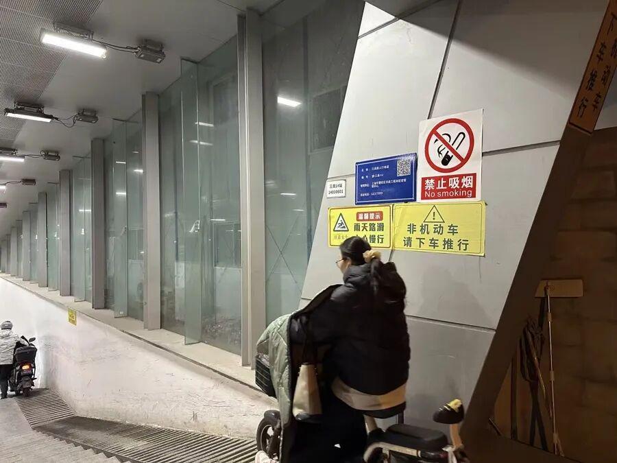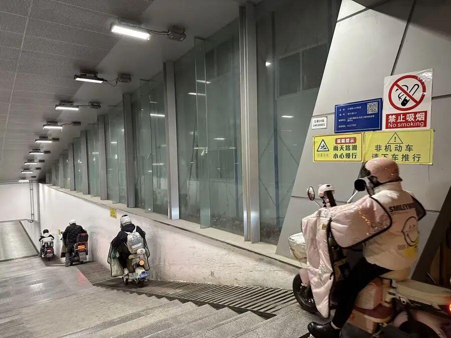 据刘先生讲,三门路地道是周边居民通勤、买菜、接送孩子的必经之路。记者在现场看到,地道出入口的坡道较为陡峭,尽管在坡道的显眼位置,竖立着蓝底白字的交通标志,清晰地写着“非机动车请下车推行”,但这些警示仿佛成了“摆设”。