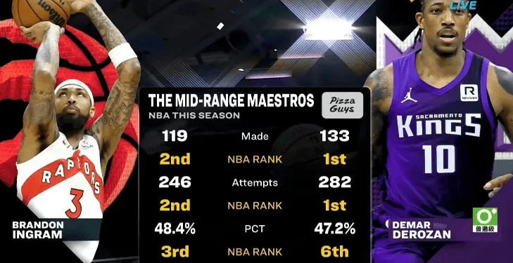 第一节比赛中,转播方列出英格拉姆和德罗赞中距离对比;